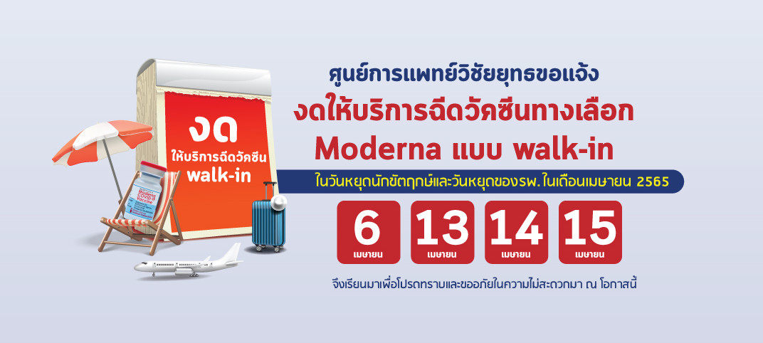 ศูนย์การแพทย์วิชัยยุทธขอประกาศแจ้งงดให้บริการฉีดวัคซีนทางเลือก Moderna แบบ Walk-in ในวันหยุดนักขัตฤกษ์ในเดือนเมษายน 2565