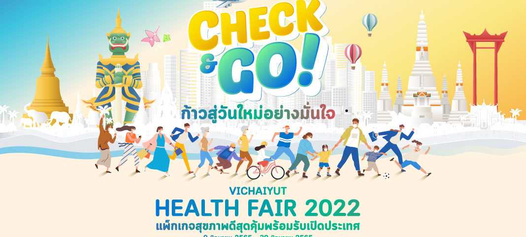 โรงพยาบาลวิชัยยุทธและศูนย์การแพทย์วิชัยยุทธ ขอมอบความปรารถนาดีให้กับทุกคนในครอบครัวด้วยแพ็กเกจสุขภาพดีพร้อมรับเปิดประเทศ ภายในงาน VICHAIYUT HEALTH FAIR 2022 “CHECK AND GO ก้าวสู่วันใหม่อย่างมั่นใจ" ระหว่างวันที่ 9 - 30 มิถุนายน 2565 ในราคาสุดคุ้ม อาทิ โปรแกรมตรวจสุขภาพ แพ็กเกจวัคซีนไข้หวัดใหญ่ แพ็กเกจตรวจระดับภูมิตอบสนองและภูมิต้านทานโควิด-19 แพ็กเกจตรวจก่อนแต่งงานและเตรียมมีบุตร แพ็กเกจออฟฟิศซินโดรม และแพ็กเกจอื่น ๆ อีกมากมาย