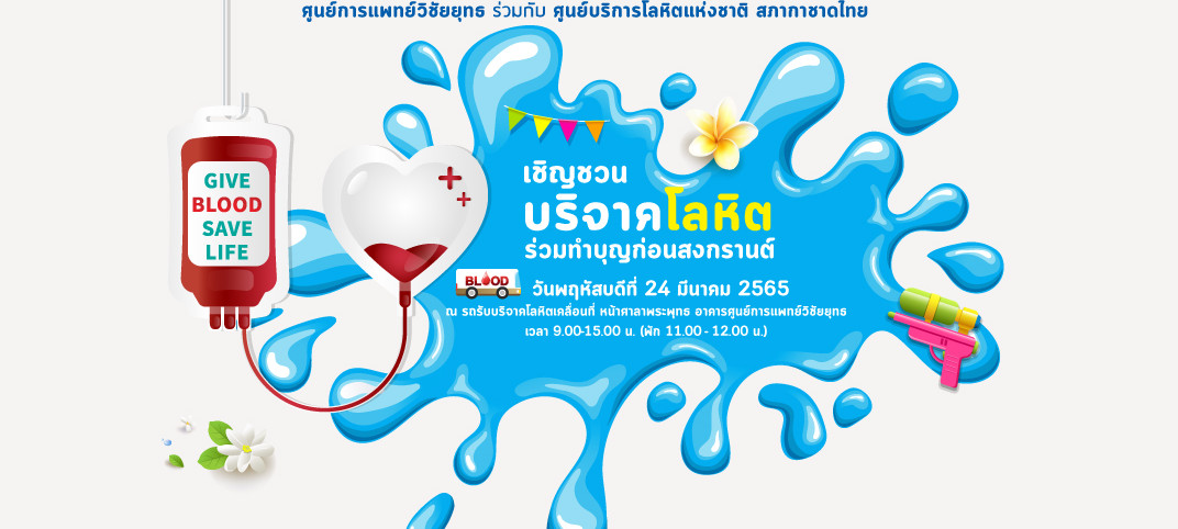 โรงพยาบาลวิชัยยุทธ ร่วมกับ ศูนย์บริการโลหิตแห่งชาติ สภากาชาดไทย เชิญชวนบริจาคโลหิตร่วมทำบุญก่อนสงกรานต์ วันพฤหัสบดีที่ 24 มีนาคม 2565 ณ รถรับบริการโลหิตเคลื่อนที่ หน้าศาลาพระพุทธ อาคารศูนย์การแพทย์วิชัยยุทธ เวลา 9.00-15.00 น. (พัก 11.00-12.00 น.)