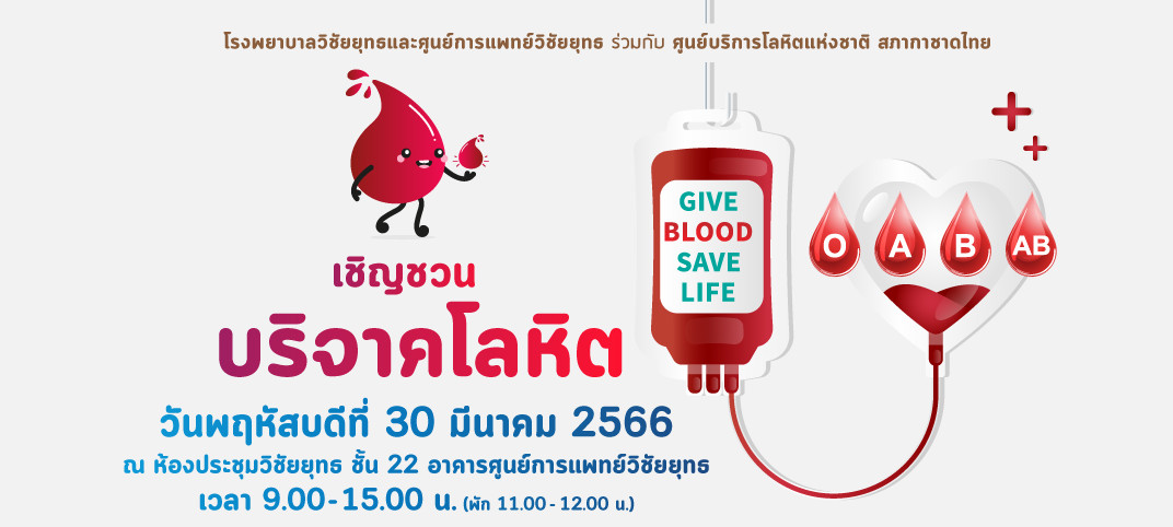 โรงพยาบาลวิชัยยุทธและศูนย์การแพทย์วิชัยยุทธ ร่วมกับ ศูนย์บริการโลหิตแห่งชาติ สภากาชาดไทย เชิญชวนร่วมบริจาคโลหิตในวันพฤหัสบดีที่ 30 มีนาคม 2566 ณ ห้องประชุมวิชัยยุทธ ชั้น 22 อาคารศูนย์การแพทย์วิชัยยุทธ เวลา 9.00-15.00 น. (พัก 11.00-12.00 น.)