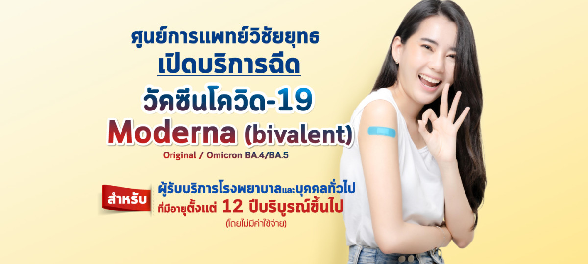 ศูนย์การแพทย์วิชัยยุทธเปิดบริการฉีดวัคซีนโควิด-19 Moderna (bivalent) สำหรับผู้รับบริการของโรงพยาบาลและบุคคลทั่วไปที่มีอายุตั้งแต่ 12 ปีบริบูรณ์ขึ้นไป (โดยไม่มีค่าใช้จ่าย) ตั้งแต่วันที่ 21 เมษายน 2566 เวลา 13.00-16.00 น. เป็นต้นไป (จนกว่าวัคซีนจะหมด) เปิดบริการทุกวัน ไม่เว้นวันหยุดนักขัตฤกษ์ ณ ศูนย์ตรวจสุขภาพ ชั้น 11 อาคารศูนย์การแพทย์วิชัยยุทธ สอบถามเพิ่มเติมได้ที่ ศูนย์ตรวจสุขภาพ โทร. 02-265-7777
