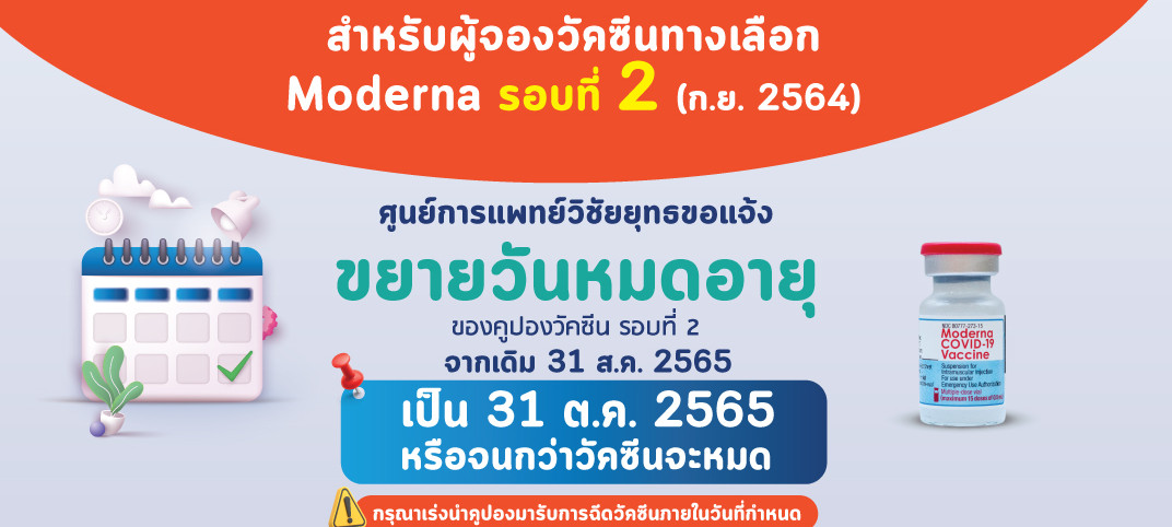 ศูนย์การแพทย์วิชัยยุทธ ขอแจ้งขยายวันหมดอายุคูปองของวัคซีน สำหรับผู้จองวัคซีนทางเลือก Moderna รอบที่ 2 (ก.ย.2564) ขยายวันหมดอายุของคูปองวัคซีนจากเดิม 31 สิงหาคม 2565 เป็น 31 ตุลาคม 2565